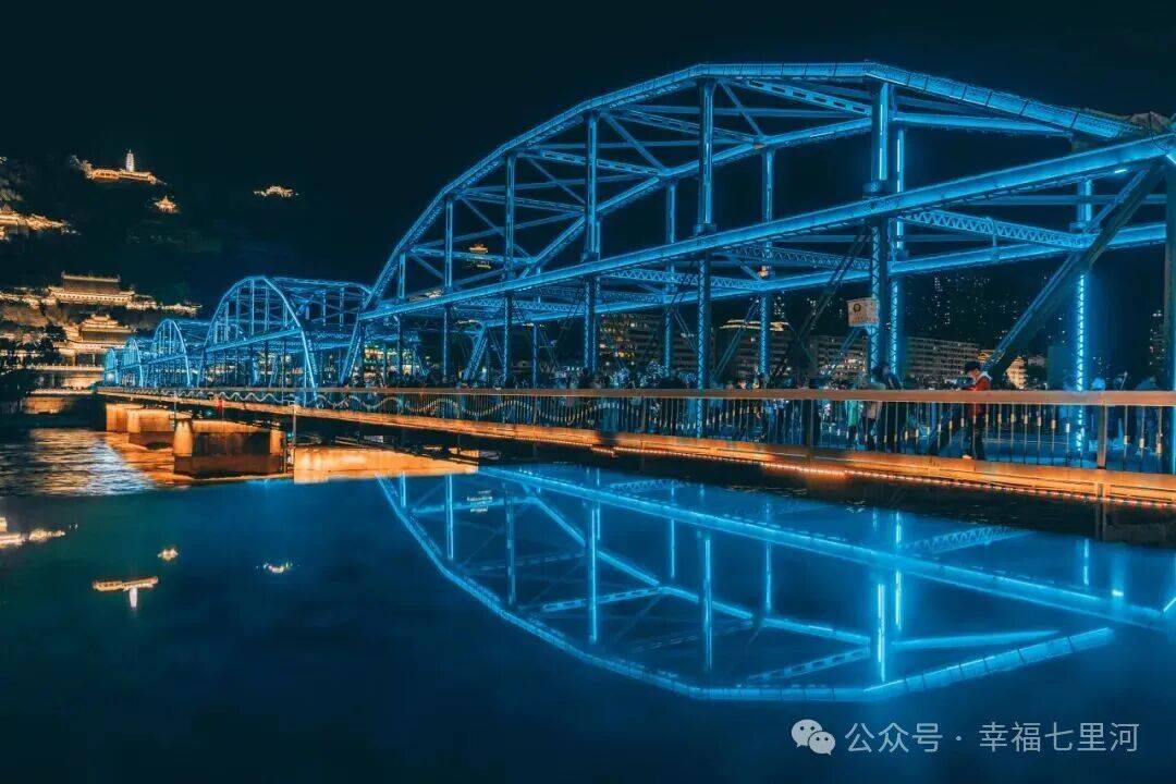 中山桥,西北地区首座引进外国技术建筑的桥梁,是黄河上修建最早和唯一保存至今的近现代钢架梁桥,集使用、历史和文物价值于一身,夜晚彩灯闪耀,周边夜景十分漂亮。
