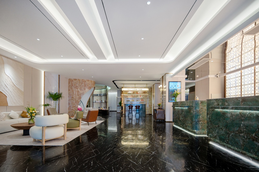 步入酒店大堂,现代雅致的氛围扑面而来。大堂设计简约大气,深色石纹地面与柔和的灯光、精致的软装交织出温馨质感。休息区摆放着柔软沙发与清新绿植,一旁的饮品吧更具巧思,营造出松弛氛围,仿佛在邀请宾客卸下疲惫,与同行者共享轻松时刻。