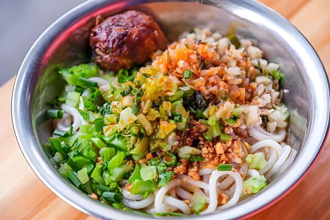 它的名字来源于其独特的制作方式:将特制的米浆通过带孔的锥形漏斗“滤”入滚水中,形成一根根粗细自然的米线。滤粉口感软糯且容易挂汁,通常配以烧炙、头菜、腐乳、花生等配料。每一碗都带着手工制作的痕迹,是质朴扎实的乡土风味。